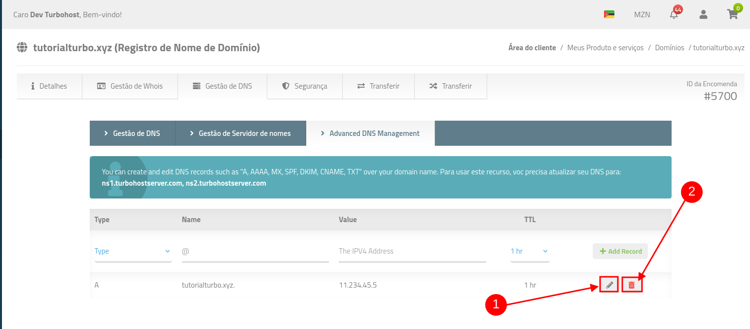 To edit or remove existing DNS records, use the corresponding buttons next to each line, as shown in the interface.