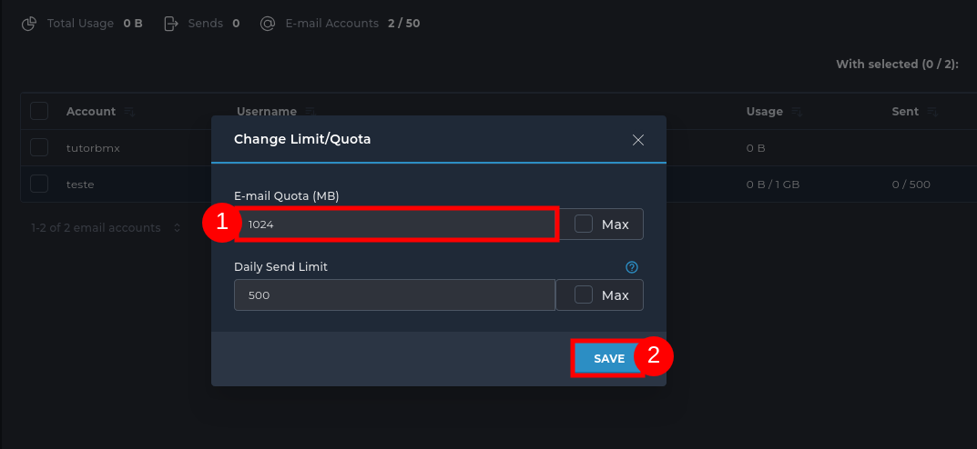 1- In the Email Quota (MB) field, set the new storage limit for the mailbox
