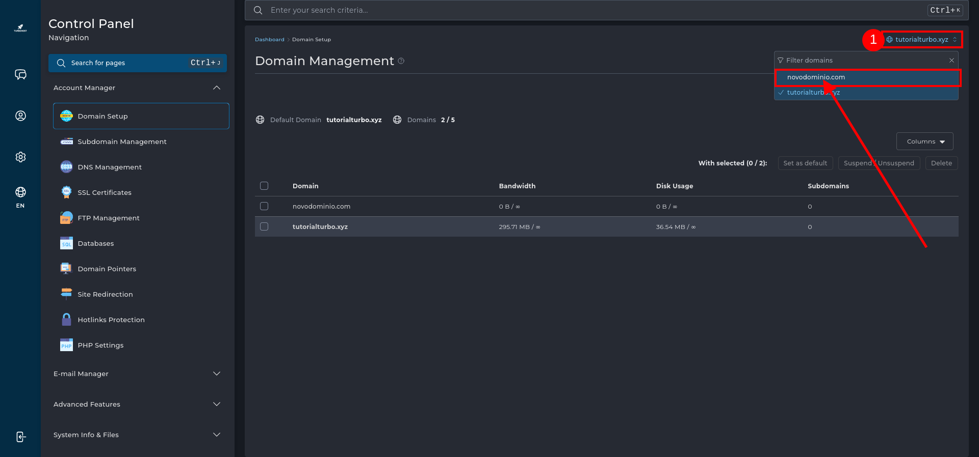 Basta selecionar o domínio desejado no canto superior direito do painel (caso esteja disponível essa opção) ou acessá-lo diretamente pelo menu principal.