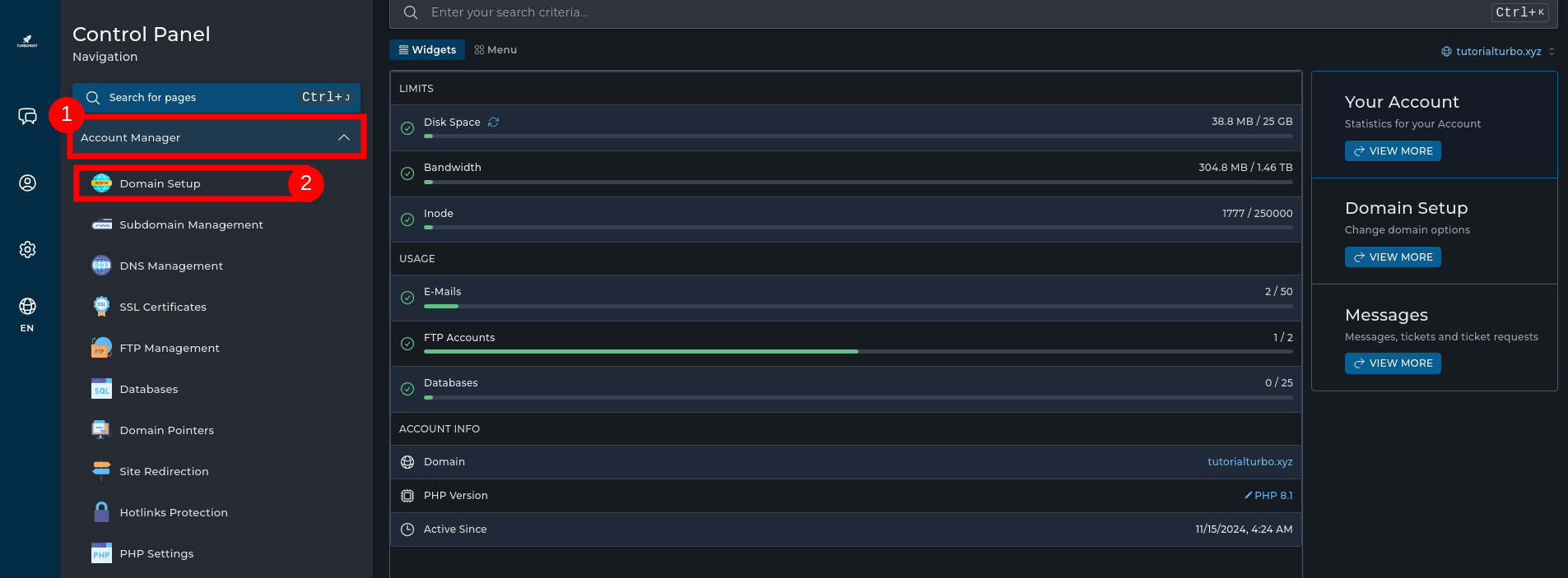 Em seguida, selecione a opção "Domain Setup".