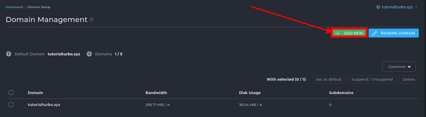 Você verá uma mensagem de confirmação e poderá visualizar o novo domínio na tela principal do Domain Setup.