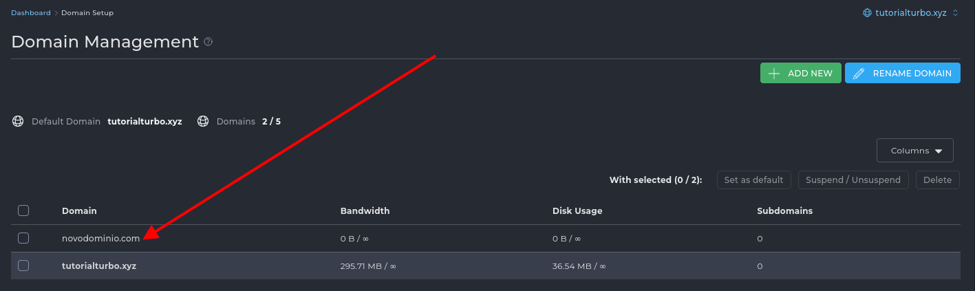 O domínio será adicionado com sucesso e passará a aparecer na lista de domínios da conta.