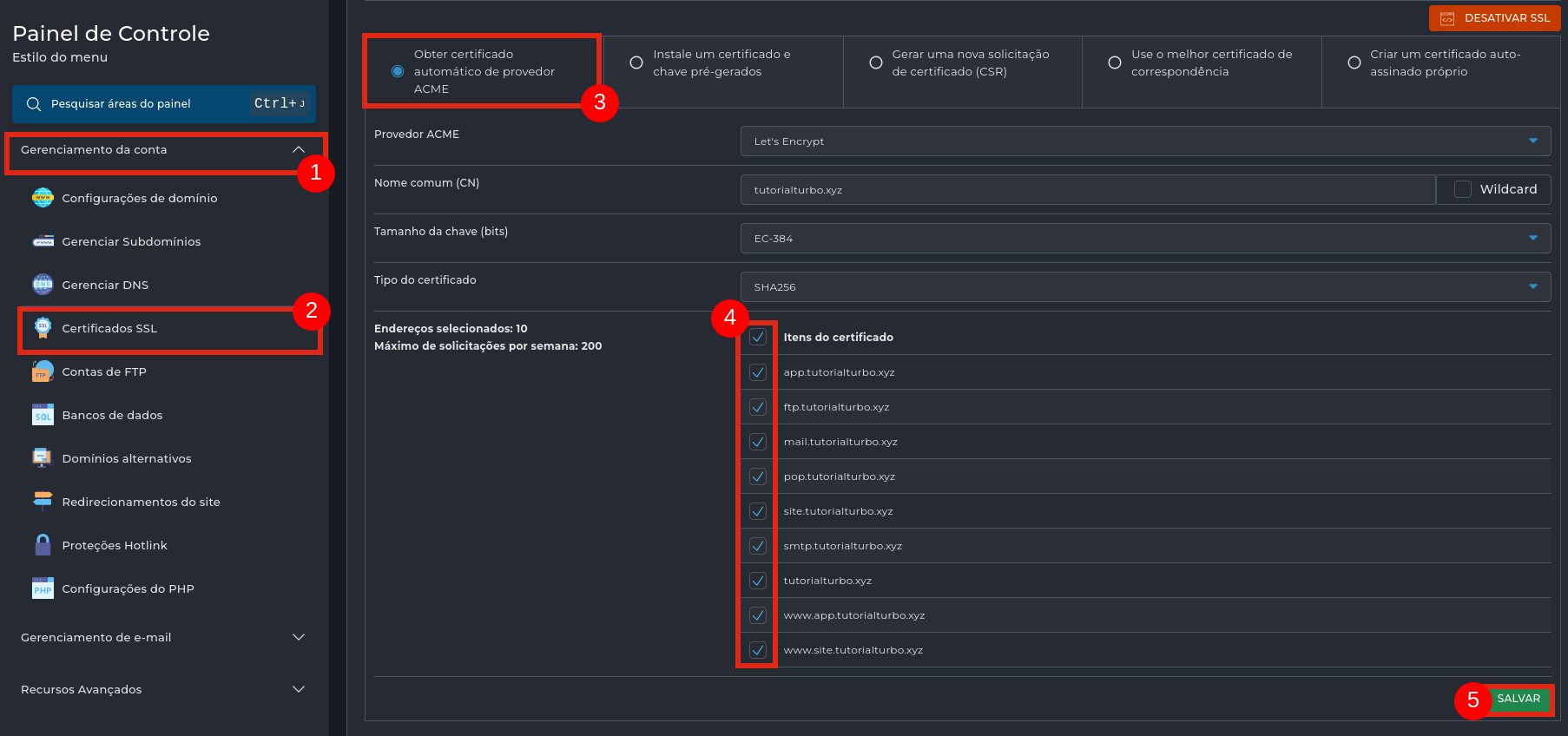 1. Clique em SALVAR para gerar e instalar o certificado SSL.